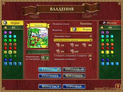 Скупив все земли одного цвета, вы сможете строить на любой из них корабли. Чем больше кораблей построено на земле — тем больше должны будут платить соперники.Но чтобы скупить все земли самому, нужна почти невероятная удача. Поэтому с противниками придется постоянно заключать сделки, обмениваясь землями. Дополнительный интерес игре придают специальные поля: например, игорный дом, где вы сможете попытать счастья за игрой в рулетку, тюрьма, в которой придется пропустить три хода или искать способ выбраться, и другие.