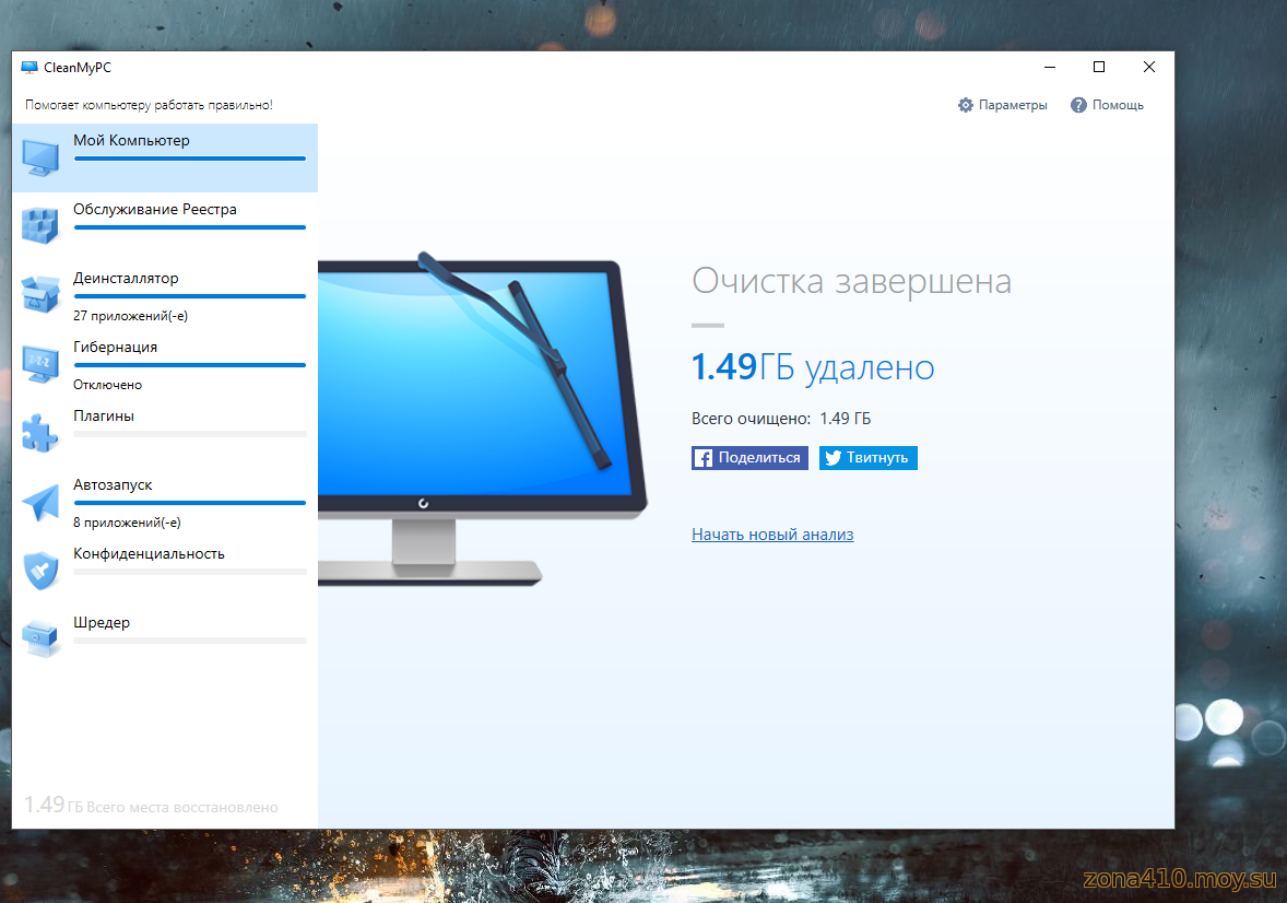 Эта замечательная программа очищает компьютер от ненужных файлов, системного мусора, остатков ранее удалённых приложений и освобождает место на диске, а также обеспечивает более быструю работу Windows.